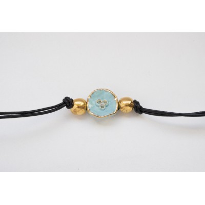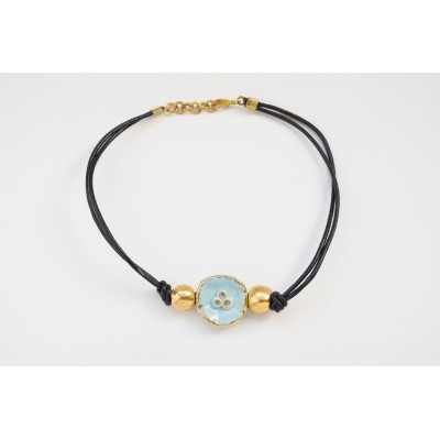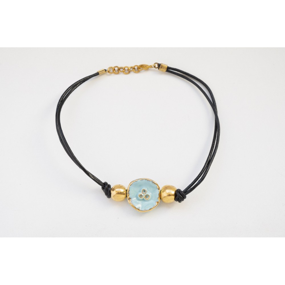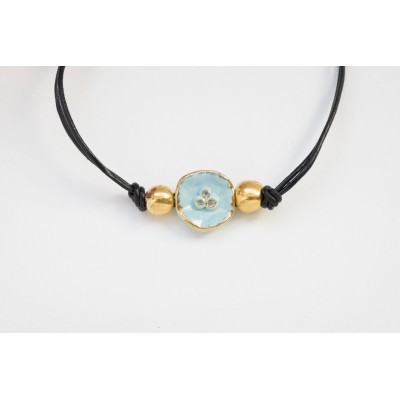 Tour de cou avec 1 anémone turquoise et or 12 carats, 2 perles dorées, montées sur cordon cuir avec fermoir