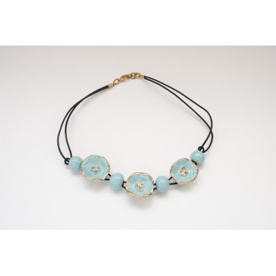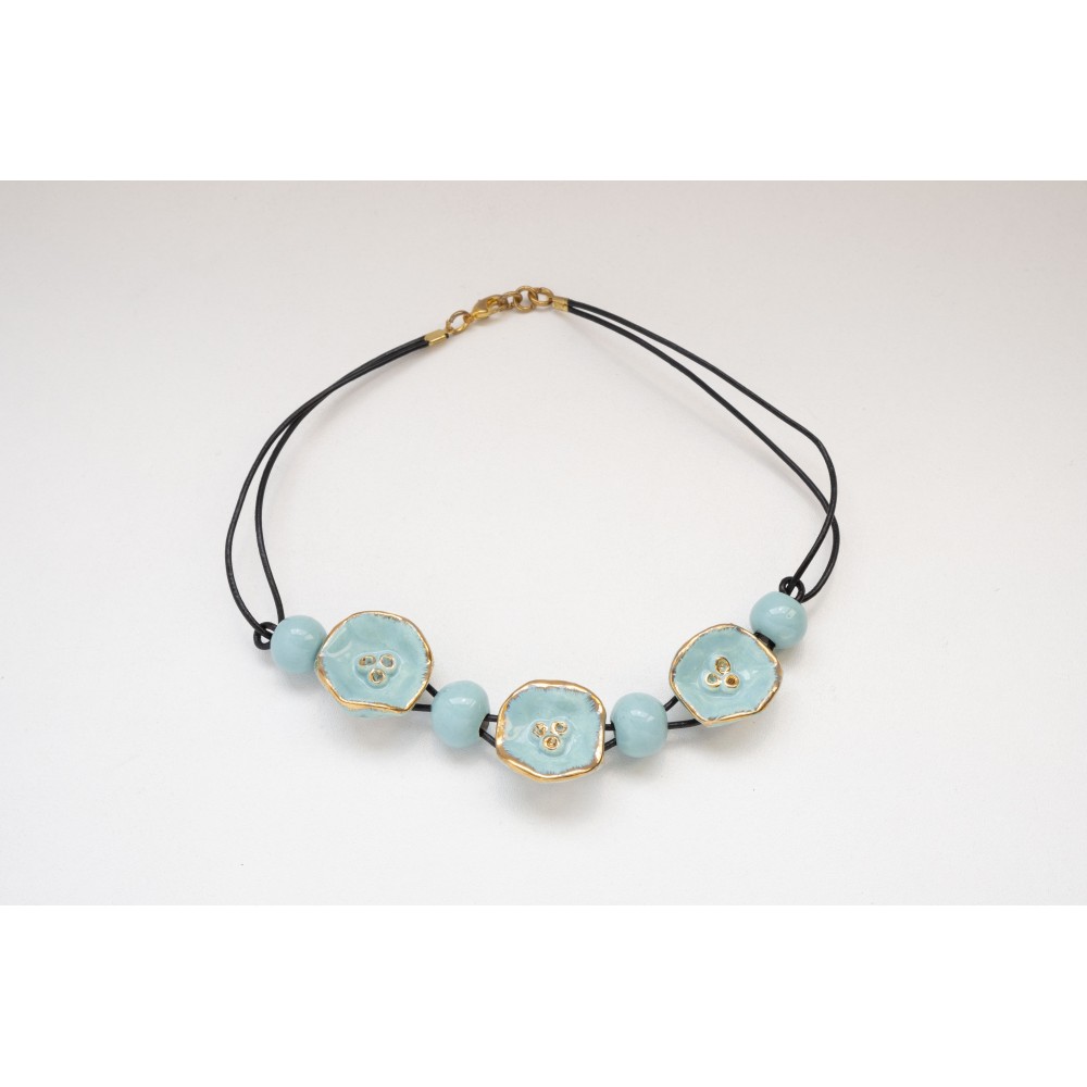 Choker with 3 turquoise flowers and 12 carats gold, and 4 turquoise pearls, mounted on leather cord with clasp